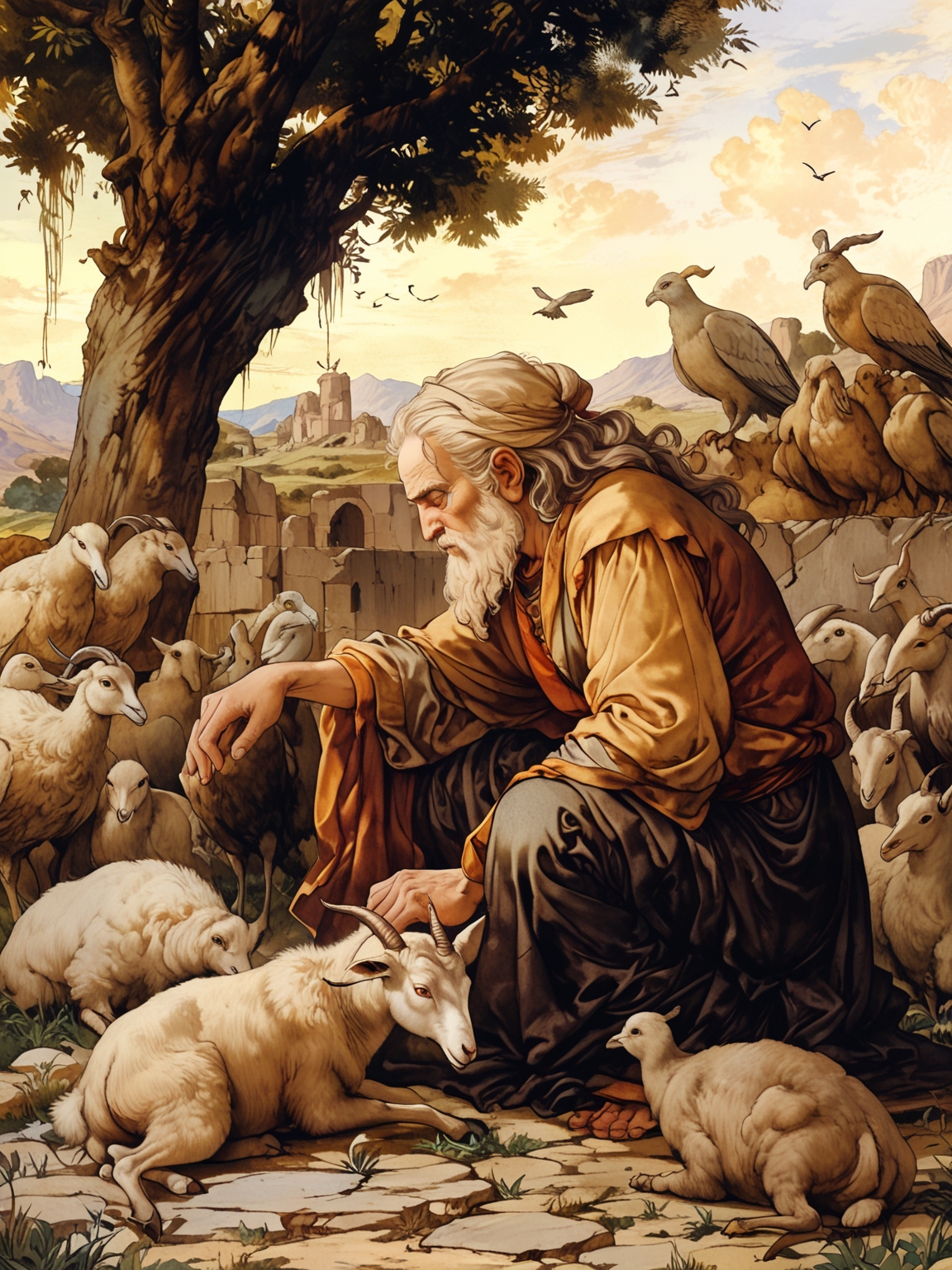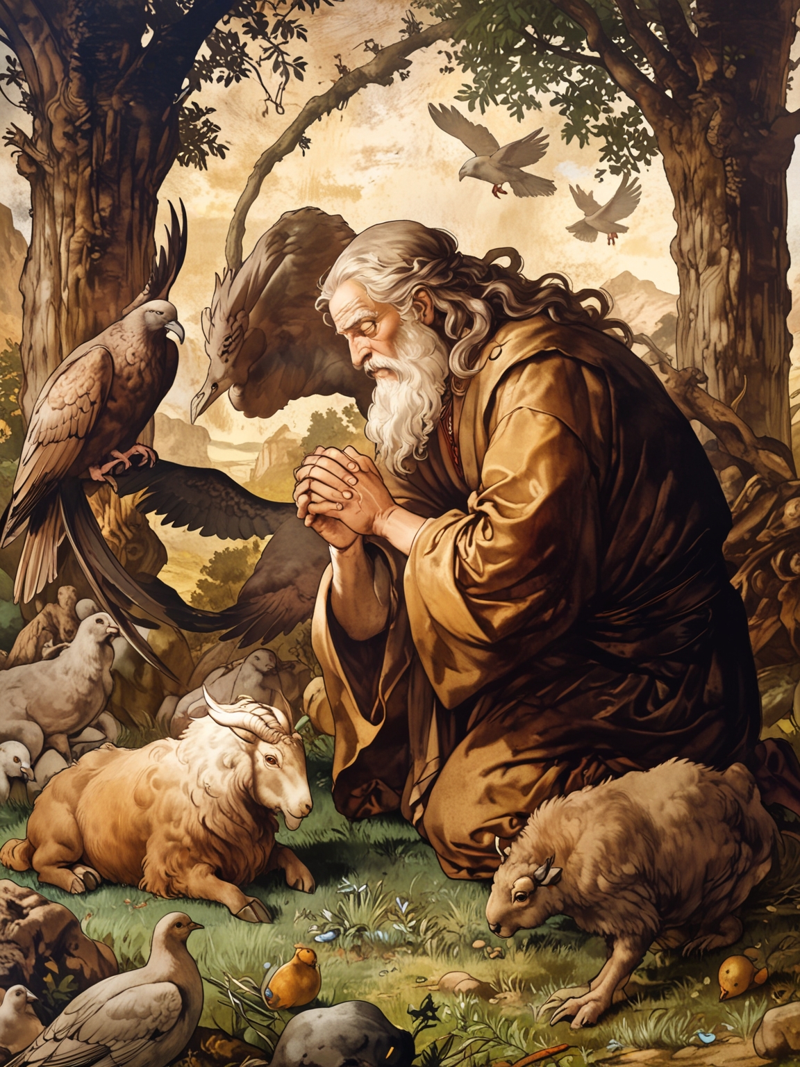 Abram brought all these to him, cut them in two and arranged the halves opposite each other; the birds, however, he did not cut in half. Then birds of prey came down on the carcasses, but Abram drove them away.