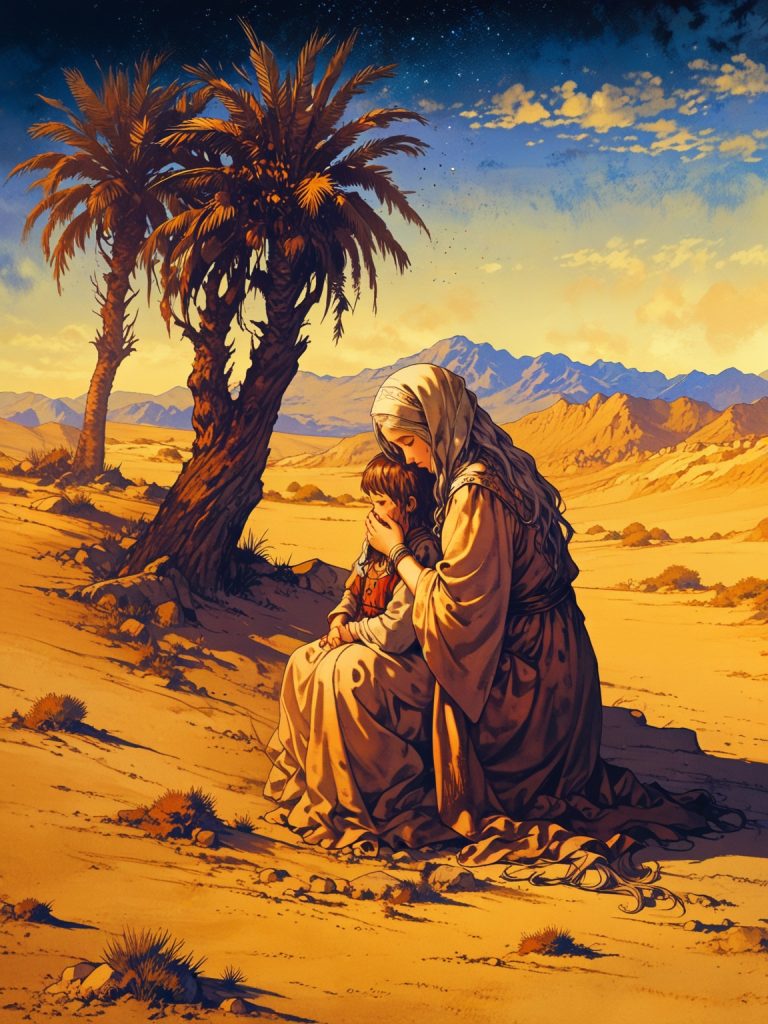 As Hagar and Ishmael journey through the harsh desert terrain, their water supply runs out. Faced with the imminent threat of dehydration, Hagar makes a heartbreaking choice: to shelter Ishmael under a bush, shielding him from the scorching sun and hoping for a miraculous provision in this desperate moment.