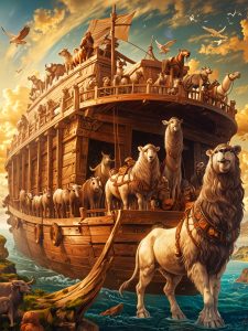 Finally, the big time arrives! Noah and his family, together with all of the preserved creatures, exit the ark and return to land. This is a striking image of a new beginning, an opportunity to start over.