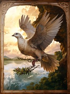 This is a turning point! The dove returns carrying a sign of life: a fresh olive leaf! Olive branches are commonly used as symbols of peace and new beginnings. This tells Noah that the worst has passed and the planet is beginning to heal.
